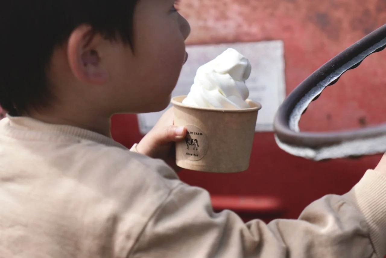 そして「長門牧場」に来たら絶対に外せないのが、名物にもなっているソフトクリームだ。牧場でしか出せない濃厚でミルキーな味は子どもも大人も満足できるものになっている。ソフトクリームの甘味そして旅の心地良い疲れのせいか、帰路の車中、息子は夢の世界に誘われていったのだった。
