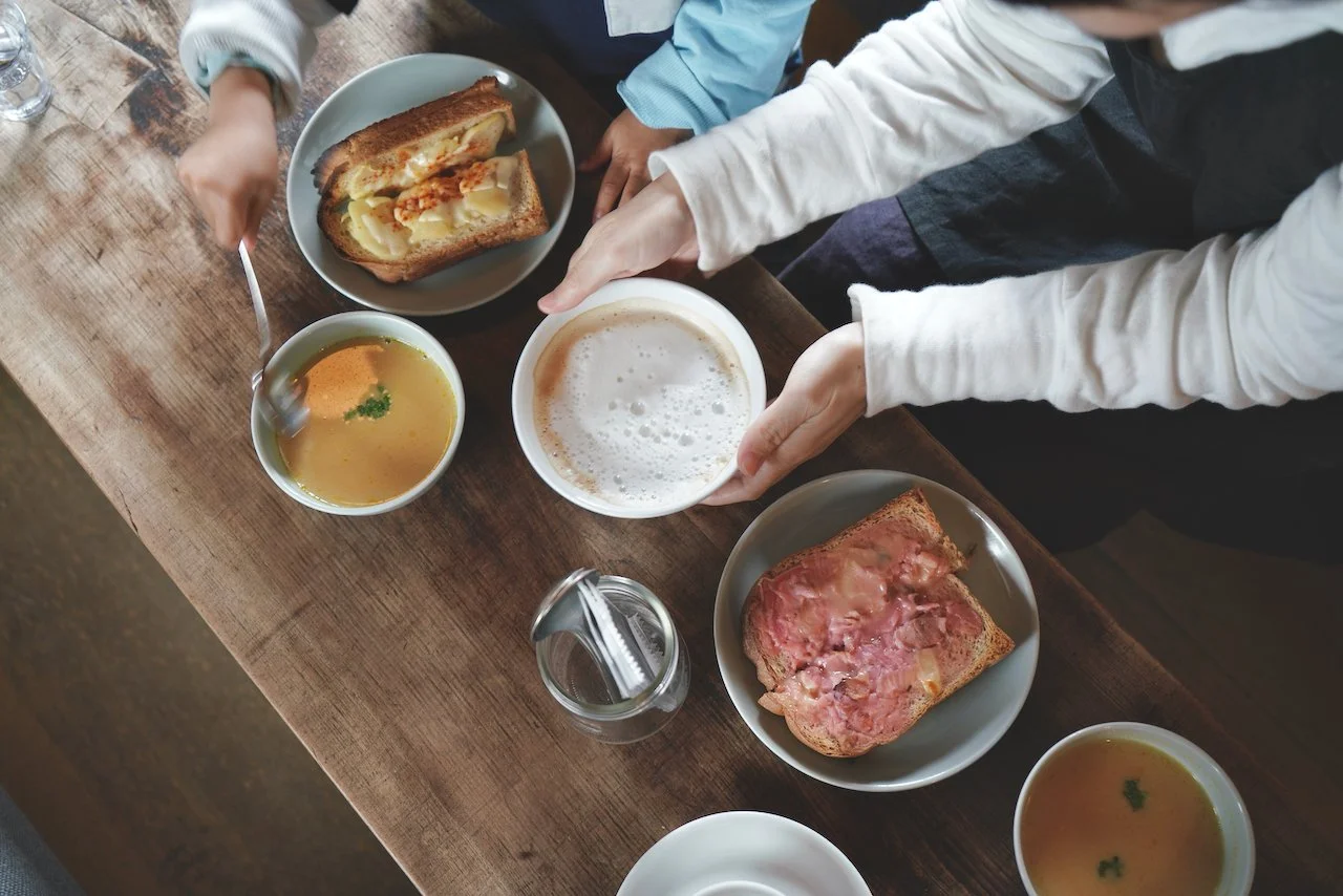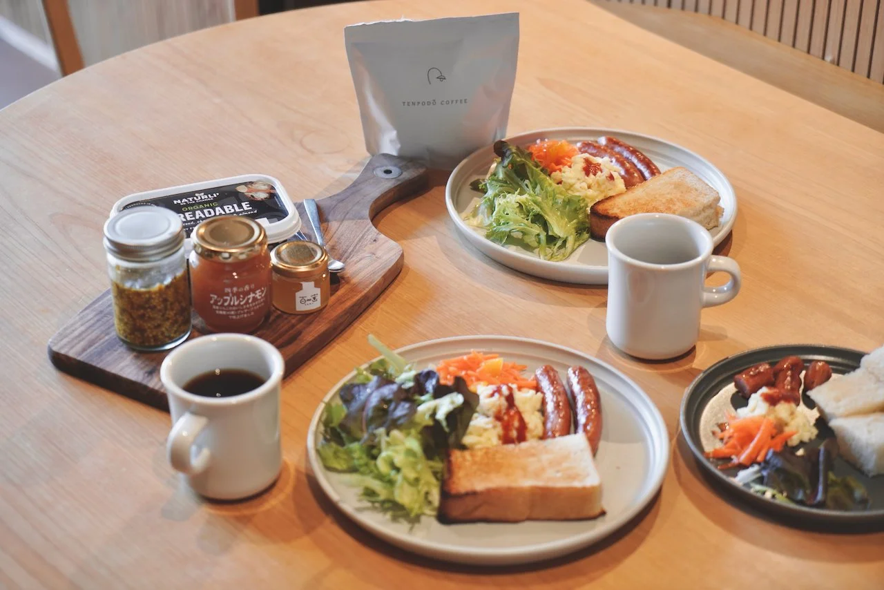 「YUSHI CAFE」で手に入れた浅煎り豆を挽いてドリップし、食パンも同じく望月の天然水湯種を使った「the OK bread & pizza」のものを用意した。