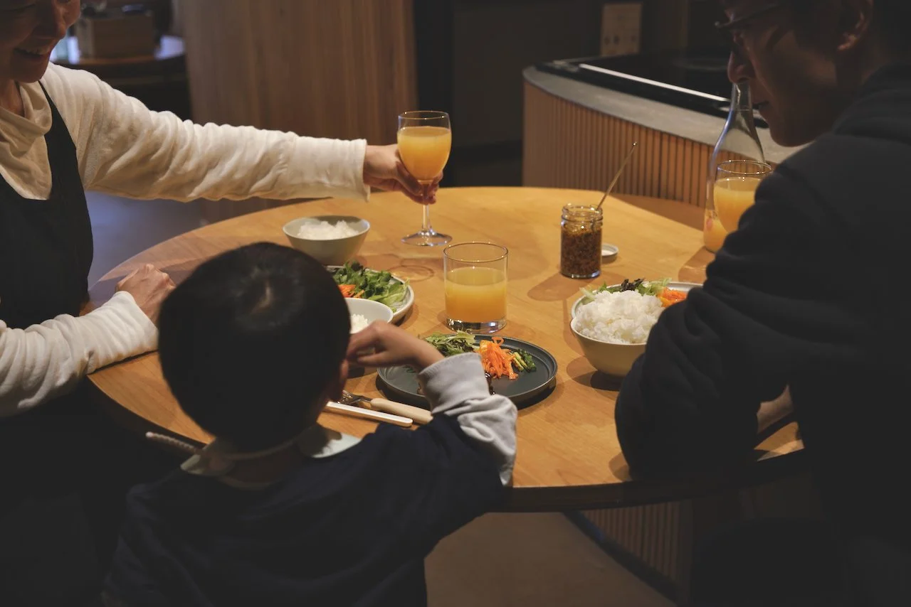 3人でそろってジュースをグラスに注ぎ、いざ乾杯。