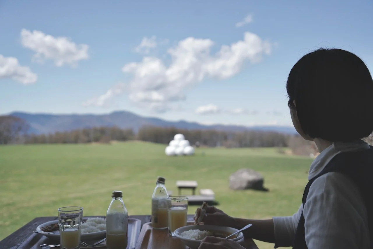キャビンを後にして、ランチをするために同じ白樺高原エリアに位置する「長門牧場」に向かった。標高1400mにある酪農から加工品の製造・販売などを手掛けている農場で、周囲に遮るものがなく、近くの蓼科山はもちろんのこと、遠くは北アルプスまで眺望でき、牧場の芝生の先の大パノラマは、天空のレストランとも形容したくなるほど。