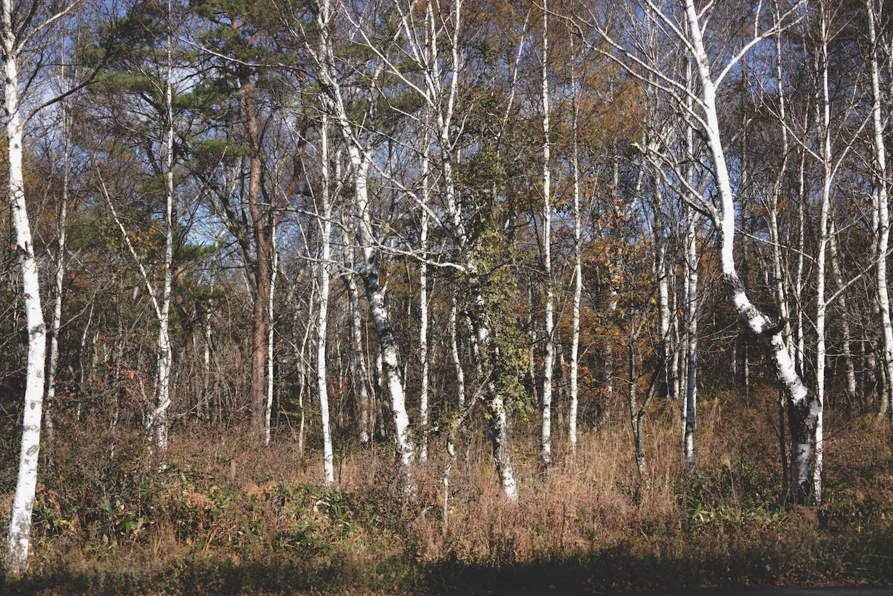 YUSHI CAFEから白樺湖1stまでは40分ほど。左右に広がるのどかな田園風景の中、標高を上げて走っていると、あるポイントから白樺の群生が現れる。