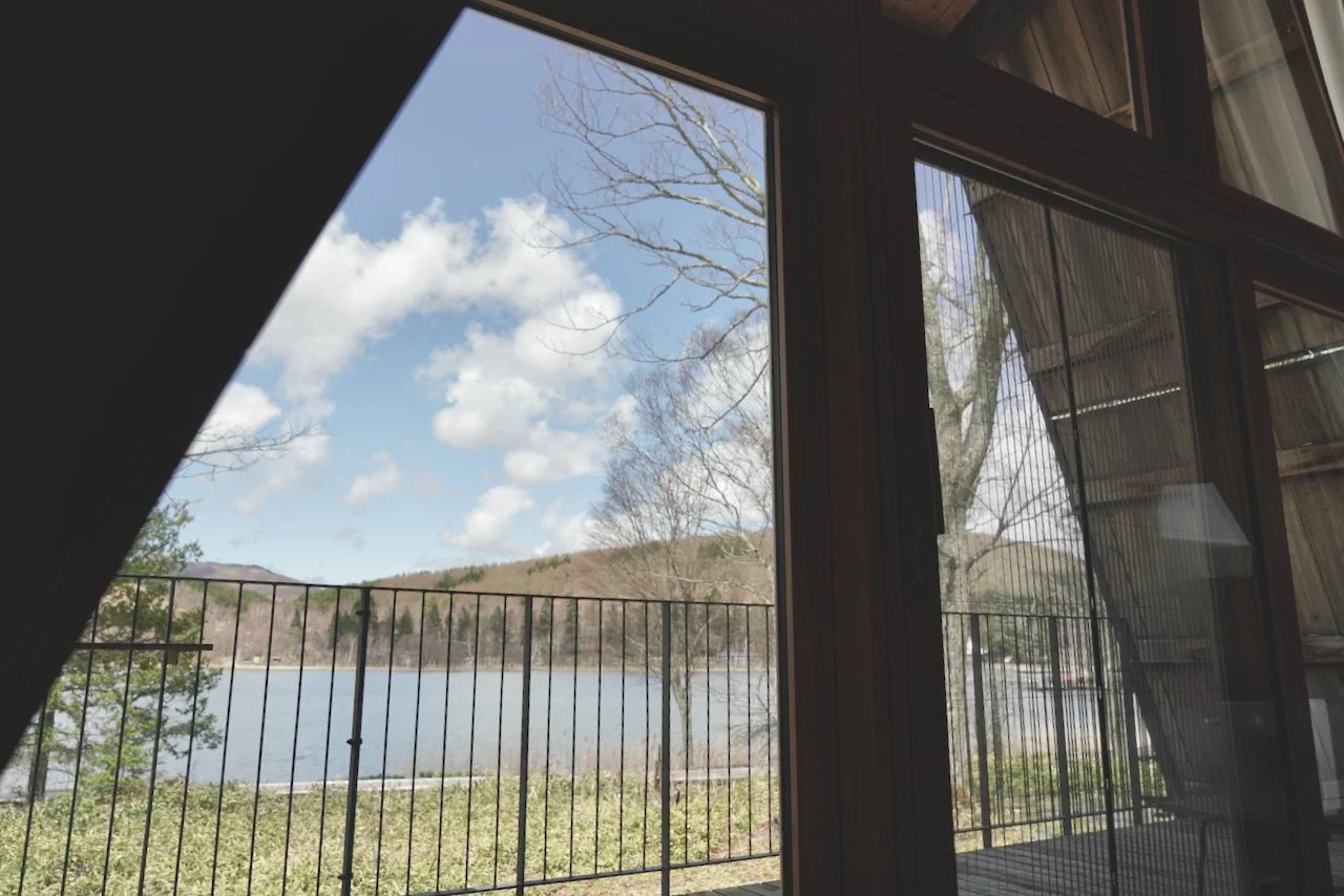 キャビンのドアを開けると、目の前に広がるのは自分たちの背丈を優に越す大きなガラス窓とその奥に広がる白樺湖の景色。