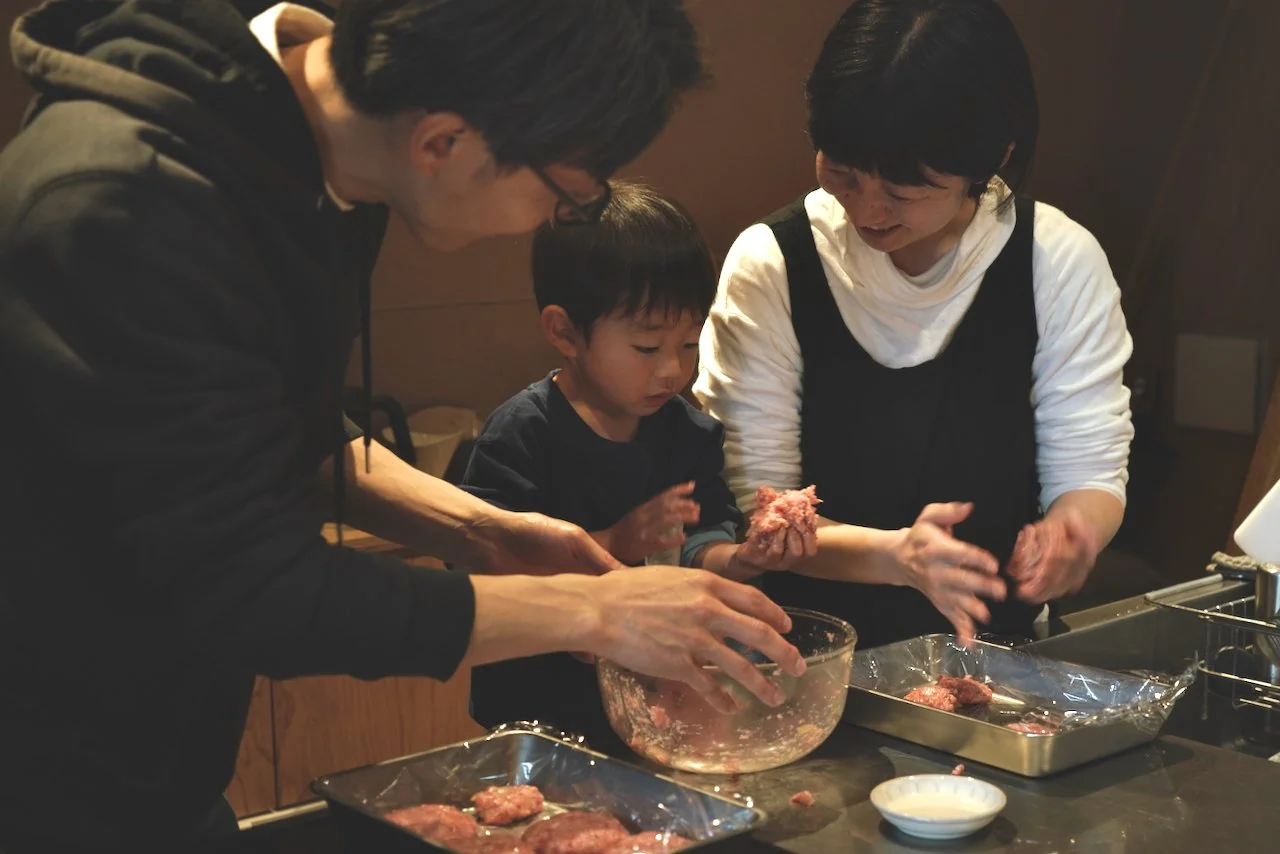 キャビンに戻ると妻がハンバーグのタネをスタンバイしてくれていた。我先にと息子がすばやく手に油をつけ、いざ3人並んで念願のハンバーグ作りがスタートする。