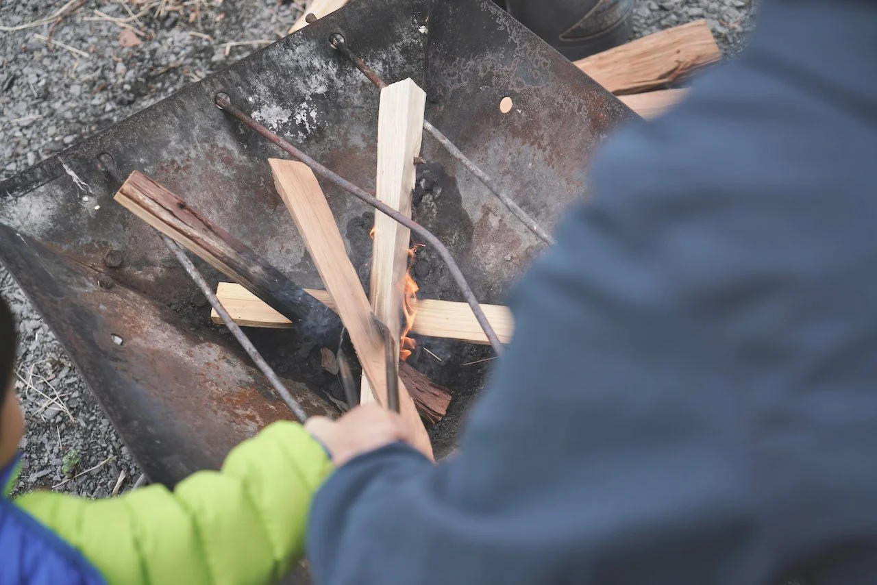 焚き火は初体験だったが、焚き火セットのバケツの中には親切に焚き火の手順がイラスト付きで記載されていたので、そこに書いてある通りに進めていくと簡単に火が薪に燃え移り、立派な焚き火となった。
