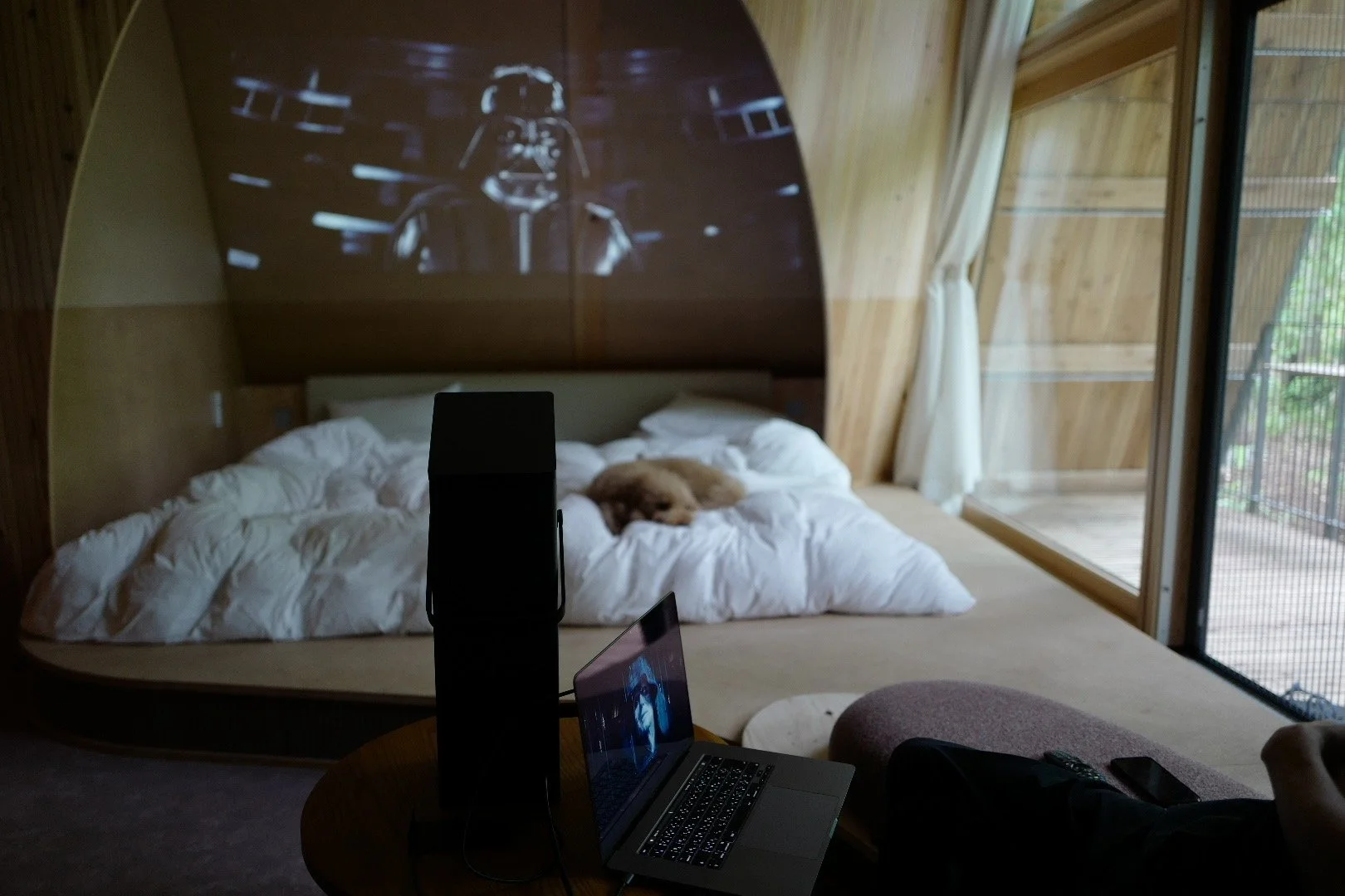 「近くの地場市場で手に入れた食材を使って料理を作って食べたり、自宅で使うお気に入りのプロジェクターを持ってきて、キャビンの大きな壁に投影して映画を見たり。そんな時間を過ごしていると、気づけばまるで自宅にいるかのようにリラックスした状態で過ごしているんです」。