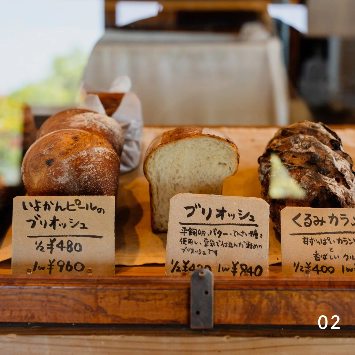 有機農法を実践する農家から仕入れた長野県産小麦と自家製酵母を使ったパンがシグネチャー。水分バランスが絶妙で、毎朝食べたいおいしさ。あちこちに手仕事を感じるアートや小物が配された店内の空間も心地よい。[02]