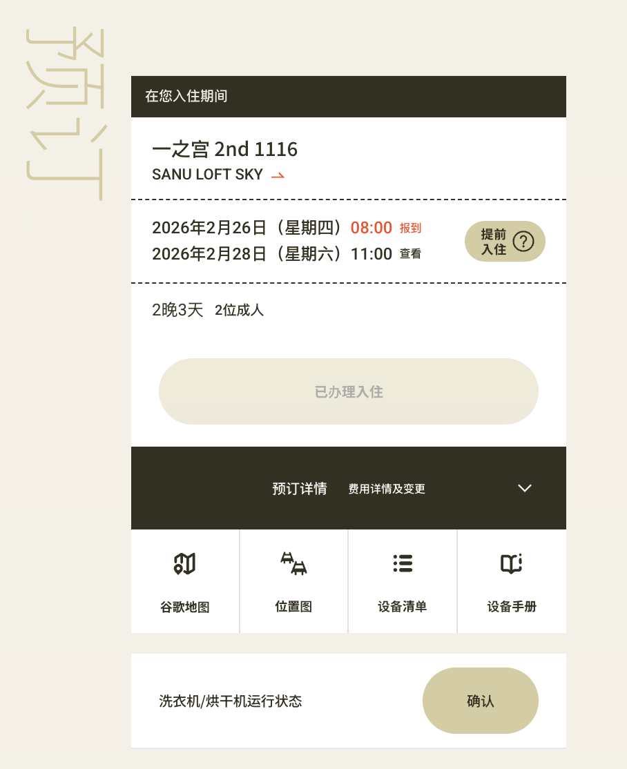 ・登录 SANU 账号 > 前往「Upcoming Reservations(即将到来的预订)」> 若显示提前入住,则表示可以使用。