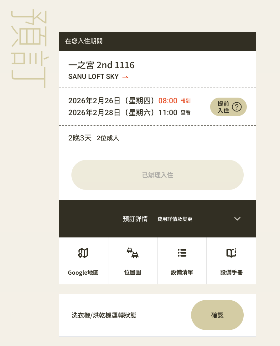 若您是透過 OTA 預約,入住時需先事前免費建立帳號,並登錄住宿者資料及付款資訊。請確認 OTA 的訊息或電子郵件,完成帳號建立及資料登錄。完成後會收到「住宿指南」郵件。